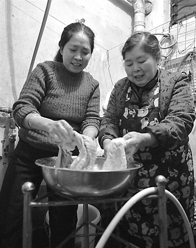 中心护理人员李华芳(左)免费上门为老人做家务。