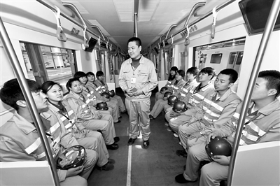 4月1日,乔志刚(中)在车厢内出题测验受训司机。