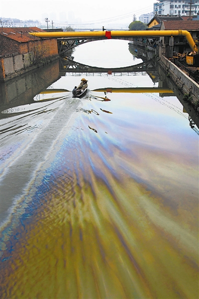4月1日,浙江省绍兴市,油污飘荡环城河。当日,浙江省绍兴市,几艘小船正疾驰在浙江绍兴市区客运中心附近飘满大量油污的环城河上。据了解这些油污是过往的大型运输船只泄露的,严重污染了绍兴美丽的环城河。 瑞昌 摄