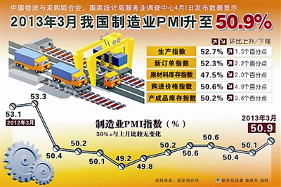 国家统计局服务业调查中心、中国物流与采购联合会1日发布报告,3月份中国制造业PMI为50.9%,不但连续半年位于临界点(50%)以上,而且比上月明显回升了0.8个百分点。制造业PMI作为国际通行的宏观经济重要先行指标,其走向往往预示着宏观经济的走向。