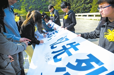 4月4日,南京一所高校的学生在雨花台烈士陵园举行纪念革命烈士集体签名活动。当日是清明节,许多南京市民和学生前往雨花台烈士陵园,以集体签名、献花、默哀等形式缅怀在此牺牲的革命先烈。新华社记者 李芒茫 摄