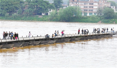 4月5日,人们行走在赣州市贡江上的古浮桥上。