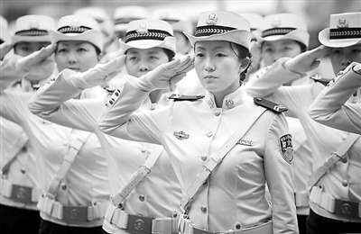 在四川省内江市,有一群英姿飒爽的“马路天使”:黑色马靴、紧身裤、白色制服……据悉,这支于2011年4月正式上岗执勤的交警女子特勤中队,由四川省内江市公安局交警支队组建,由平均年龄23岁的28名女子协警和2名女交警组成,她们担负着参与交通警卫、指挥城区交通秩序以及纠正交通违法行为等交通管理职责。 薛玉斌 摄 (新华社发)