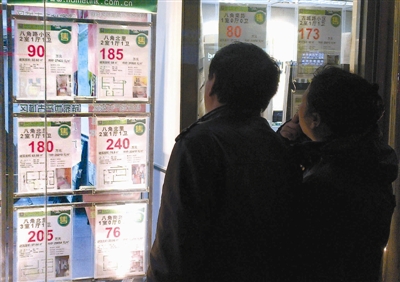 两位北京市民在房屋中介处查看二手房信息(3月30日摄)。