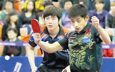 4月7日,在2013韩国乒乓球公开赛男双决赛中,由张继科(右)和韩国选手徐贤德组成的跨国组合夺冠。CFP供图