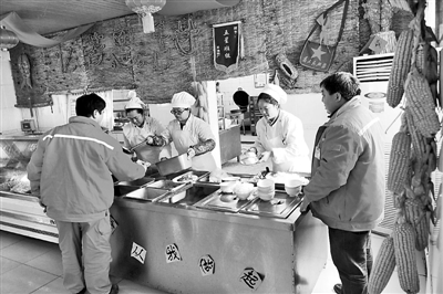 中国石化中原油田采油四厂职工食堂日前开设了节俭餐厅,主食以窝窝头、玉米面粥等为主,副食主要有苦菜等,并向就餐职工发放“光盘行动”倡议书,号召职工遏制“舌尖上的浪费”。仝江 摄