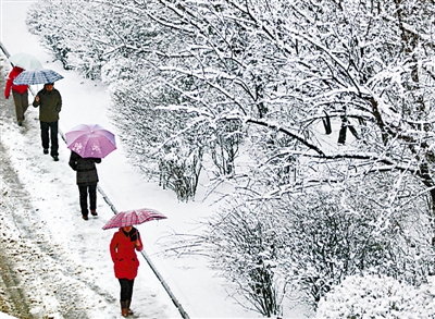 4月8日,市民在沈阳街头冒雪出行。当日清晨,辽宁沈阳普降中雪。