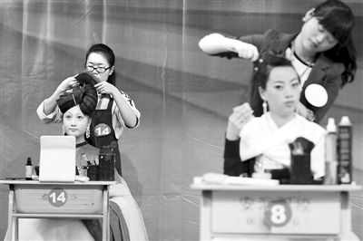 据了解,美发与形象设计竞赛共包括男士无缝推剪造型、女士短发修剪等5个项目。其中,最吸引眼球的当属新娘化妆盘发造型,来自全省各地市的18名优秀选手同台比拼。园 禾 摄