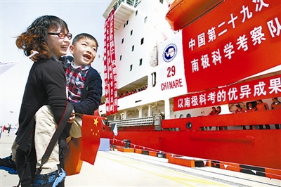 4月9日,我国第29次南极考察队乘坐“雪龙”号极地考察船凯旋,如期回到母港基地码头。过去156天里,“雪龙”号四次成功穿越西风带,总航程逾29000海里(其中冰区航行6000余海里),首次到达南纬75°7.2',开创了我国船舶航行最南纬度地区的新纪录。郭新 摄