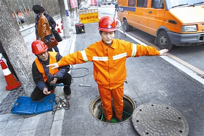 4月11日,沈阳水务集团排水管理处工作人员在演示窨井防坠网的保护功能。