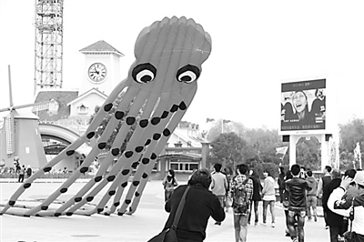 4月1日,上海踏青节32米长章鱼风筝凌空摇曳领风骚。