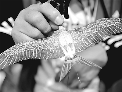 4月3日,西安第三届风筝会上制作精细的微型动态风筝“小燕子”。