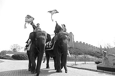 4月2日,北京世界公园游客着汉服乘泰国大象放飞风筝。