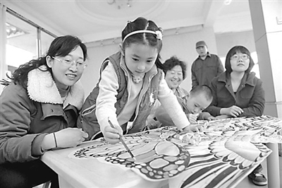 4月2日,北京陶然亭公园,小朋友和家长一起为风筝绘画上色。