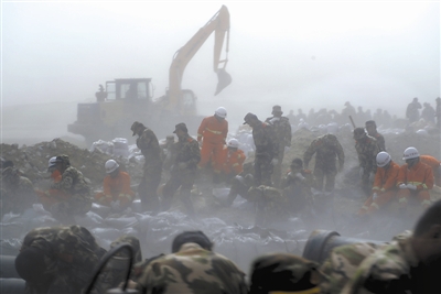 4月15日,抢险人员在宁夏石嘴山惠农区修补储灰坝。