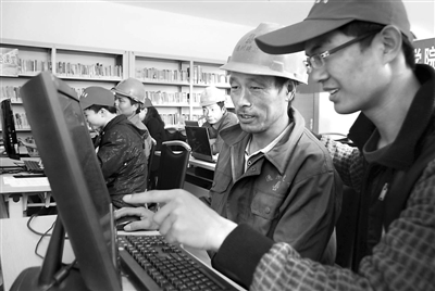 4月14日,江苏科技大学的学生在指导农民工学习网上购票技能。当日,江苏省镇江市首家农民工网络学堂在润州区七里甸街道万科社区成立,来自江苏科技大学数理学院的大学生志愿者将定期走进学堂,为当地的外来务工人员传授网上购票、网上购物、网上读书等知识和技能。本报通讯员 石玉成 汪晓慧 摄