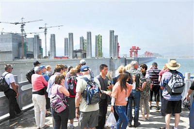 4月14日,游客在三峡大坝旅游区185观景平台游览。进入4月份以来,随着天气回暖,国家5A级景区三峡大坝旅游区提前迎来旅游旺季,日均接待国内外游客人数已突破1万人次。据长江三峡旅游部门有关负责人介绍,今年清明节3天小长假期间,三峡大坝旅游区游客接待量达3.65万人次,同比增长82.5%。王辉富 摄