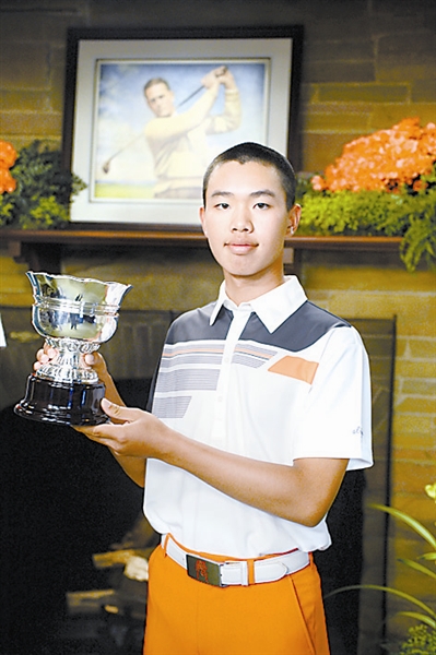 当地时间4月14日,中国小将关天朗在巴特勒小屋展示最佳业余球员银杯奖奖杯。