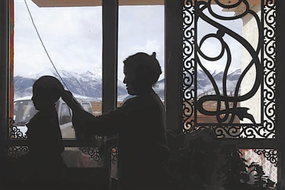 4月15日,才仁求吉在窗前为小女儿梳头发,透过窗户能清楚地看见远处被积雪覆盖的山头。她说她喜欢这样的大窗户,只是到了新家就没有这样的眼福了。