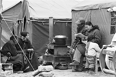 第一次和他们见面是在2010年4月14日玉树地震后的第三天清晨。一家人围坐在临时搭建的火炉前准备吃地震后的第一顿热乎饭,从废墟里抢救出来的家具上挂着一面国旗。现在回想起来,才仁求吉依然难过。“地震后那两天,人都成傻子了,什么也想不起来,连话都不会说,直到第三天才想起来给亲戚打个电话。一切都没了,想哭都哭不出来。好在人都没什么事。”