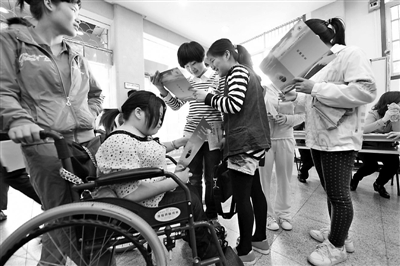 4月17日,几名来自杭州市儿童福利院的残疾青年正在招聘会现场查看招聘信息。