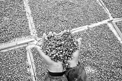 4月15日,山东省沂源县西里镇茅子峪村的农民在查看晾晒后的桃花。
