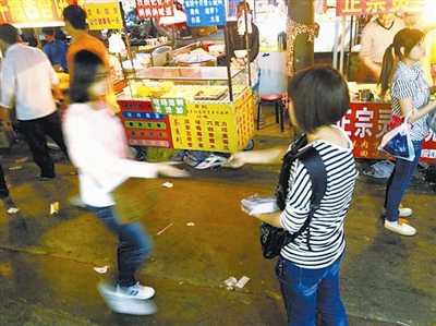 下图为4月17日晚,沙井村依旧可以见到不少发放小广告的人。 张喆 摄