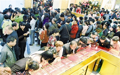 受国际金价下跌影响,连日来,南京多家金店拥入大量前来抄底抢金的市民,不少市民甚至连夜排队购买黄金。