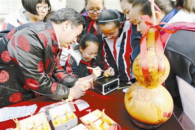 当日,北京东直门中学举办首届“传统文化校园日”活动,校方请来的北京民间技艺大师手把手教学生体验制作雕漆、料器、泥塑、糖画等十余种传统工艺。