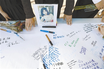 4月17日,大学生们在美国波士顿大学校园内为遇难的中国留学生吕令子签名祈福。 新华社记者 王雷 摄
