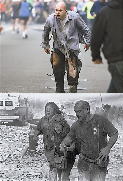 上图为当天在波士顿爆炸现场的市民出来的情景,下图为2001年9月11日“9·11”恐怖袭击之后,市民相互搀扶从事发现场出来的景象。CFP供图