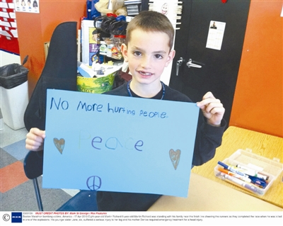 8岁的理查德·马丁生前展示写着“和平”的作品。东方IC 供图