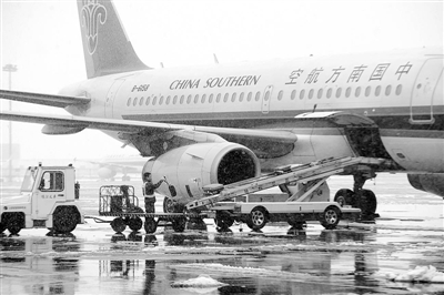 4月19日,太原武宿机场整备人员将行李运上客机。当日太原遭遇强降雪天气,武宿机场一度因雪无法起降。目前,随着跑道清雪工作的开展,部分航班已恢复起降。新华社记者 范敏达 摄