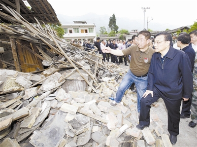 上图为李克强在受灾严重的双石镇察看灾情。 新华社记者 黄敬文 摄