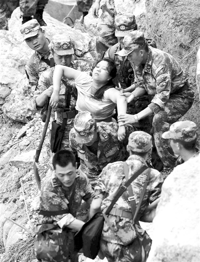 携带着卫星通信设备、生命探测仪等设备,由医疗、卫生、消防等部门组成的一支又一支救援力量,冒着余震不断、山石滚落的危险,快速向灾区挺进……