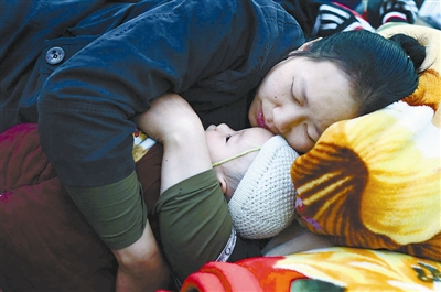 4月21日,芦山县太平乡安置点,一位母亲在熟睡时紧紧抱着孩子。 “4·20”芦山地震给当地居民的生活造成很大破坏,但灾区群众在各方的帮助下,迅速投入到自救和生产生活之中。在条件简陋的临时居所里,生活依然在继续。新华社记者 江宏景 摄