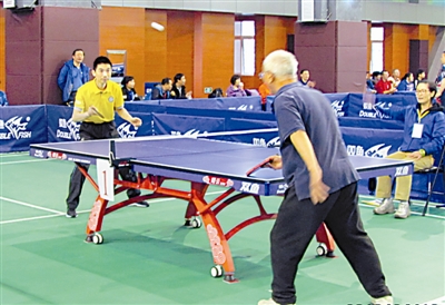 中国电子体协职工乒乓球赛,选手中不乏白发苍苍的退休老职工。他们多是有着三四十年球龄的乒乓爱好者。