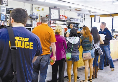 当地时间4月19日,美国德州韦斯特镇上最有名的小吃店Czech Shop一改昨日的冷清,购买食物的顾客排起了长队。美国德州小镇韦斯特化肥厂4月17日晚间发生大爆炸,官方宣布,已确定16人遇难,约200人受伤。目前小镇居民逐渐恢复正常生活。王欢 摄