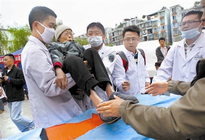 4月21日10时10分,在芦山县人民医院,医护人员为伤员治疗。