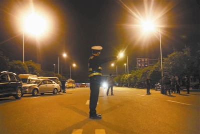 4月21日5时,连续工作了20个小时的交警,依然坚守在雅安街头。
