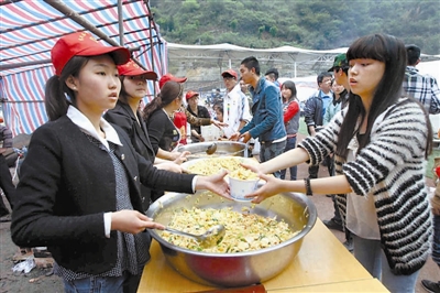 4月22日13时23分,宝兴县城受灾群众安置点,中学生志愿者为受灾群众分发午饭。