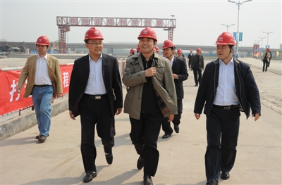 五公司党委书记刘勇霖 ( 右一 ) 、 项目经理代敬辉 ( 左二 ) 陪同上级领导检查工地
