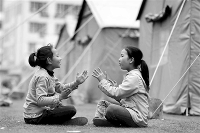 4月22日下午,在四川雅安宝兴县一受灾群众安置点,两个小学生在帐篷前做游戏。芦山地震发生后,与芦山县毗邻的宝兴县断水、断电、断通讯,成为一座“孤岛”。经过救援抢险队33个小时的艰苦奋战,通往宝兴震区的生命通道于21日下午全线抢通,物资陆续运往宝兴,帮助受灾群众渡过难关。 本报记者 杨登峰 摄