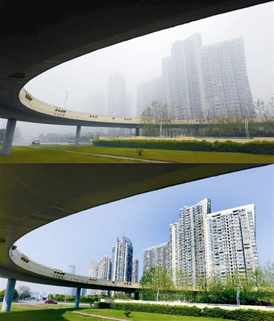 南昌市红谷滩新区一处楼盘在雾霾中(上图,4月1日摄)和晴好天气下(下图,4月7日摄)的对比(拼版照片)。