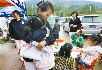 4月24日中午,在芦山体育场安置点,来自台湾的志愿人员安慰一位小朋友。芦山地震发生时,台湾客人恰好在四川,在第一时间赶到芦山,对灾区孩子们进行心理辅导。