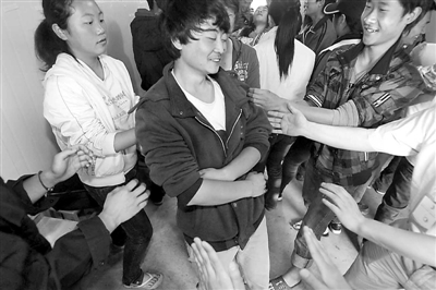 4月24日,在芦山县中学刚刚搭建好的板房教室里,学生们在心理老师的辅导下做游戏。四川芦山地震发生后,学校和志愿者们及时对灾区学生进行心理干预,力争将地震对他们造成的心理伤害减到最小。本报记者 杨登峰 摄