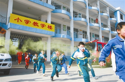 近日,山东乳山市公安消防大队联合乳山寨小学在校内举行了一场火场逃生大演练,参加演练的学校师生达500余人。演练结束后,消防战士还在现场给小学生们上了一堂安全教育课。陈剑 摄