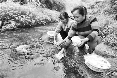 图为福州闽侯县大湖乡六锦村村民在整治后的村前小溪边洗菜。
