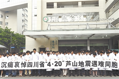 4月27日,四川大学华西医院医务工作者向芦山地震遇难同胞默哀。当日,社会各界人士哀悼四川芦山“4·20”7.0级强烈地震遇难者。新华社发(李向雨 摄)