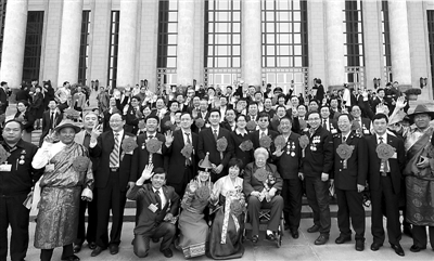 4月28日,庆祝“五一”国际劳动节大会闭幕后,进京参加“五一”庆祝活动的劳模代表们在北京人民大会堂东门外的台阶上合影留念。本报记者 许之丰 摄